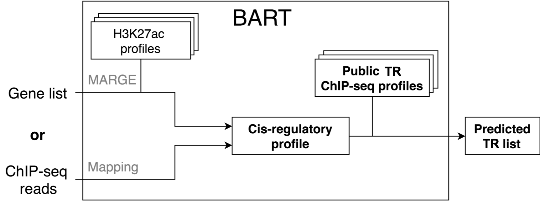 This web server is to perform BART, a bioinformatics tool for predicting functional factors (including transcription factors and chromatin regulators) that bind at cis-regulatory regions to regulate gene expression in human or mouse, taking a query gene list or a ChIP-seq dataset as input.